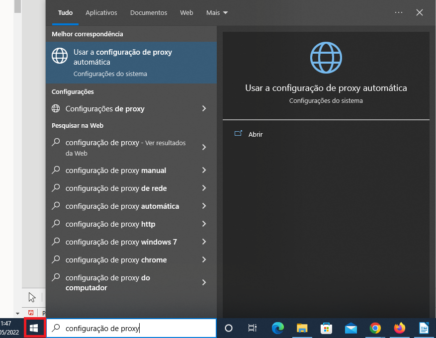 Passo 1 Clique com o botão esquerdo do mouse em Iniciar, digite proxy e clique configuração de proxy: